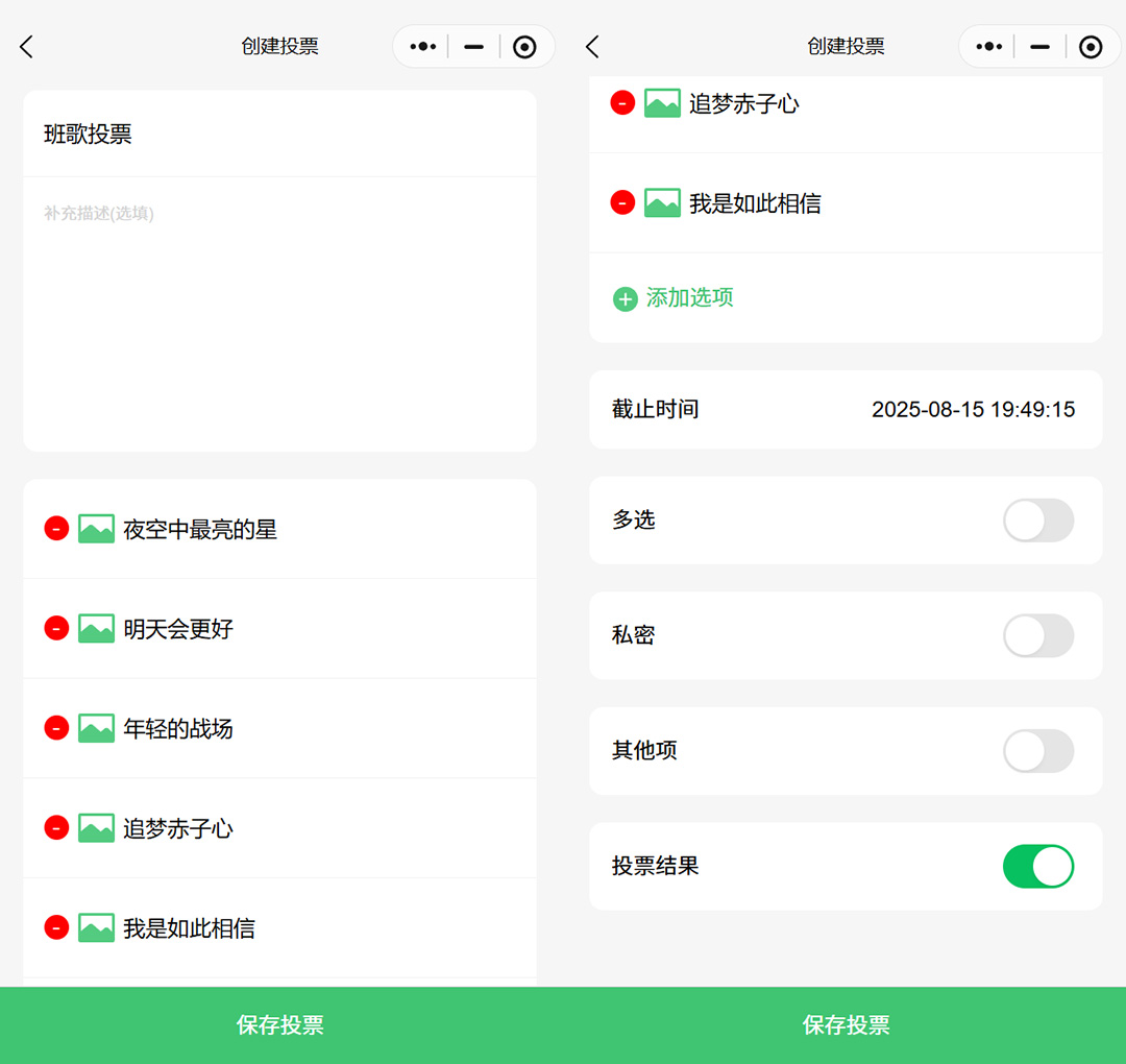 填写投票信息:首先要确定投票标题,比如 “2025 年上半年入团积极分子推荐投票”“团建主题选择” 等,让大家一眼就知道投票的目的。接着可以添加描述,简单说明投票的背景或要求。然后就是设置投票选项,像评选人选、活动方案等,根据需要点击 “添加选项” 就能增加内容。