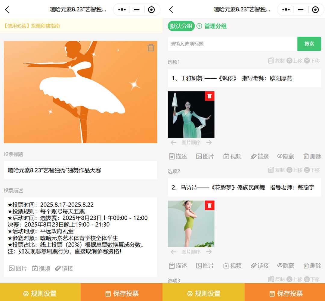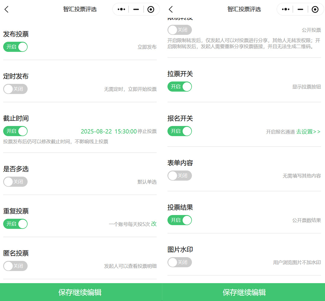 投票规则的自定义功能也十分贴心,可根据活动性质灵活调整。时间上能精准设置开始和截止时间节点,比如9月20日9:00至9月23日21:000;投票方式上支持单选或多选、匿名或实名、公开或内部投票等多种组合;还能限制重复投票次数,像每人每日限投1次,每次可投2-3票等,确保投票公平公正。