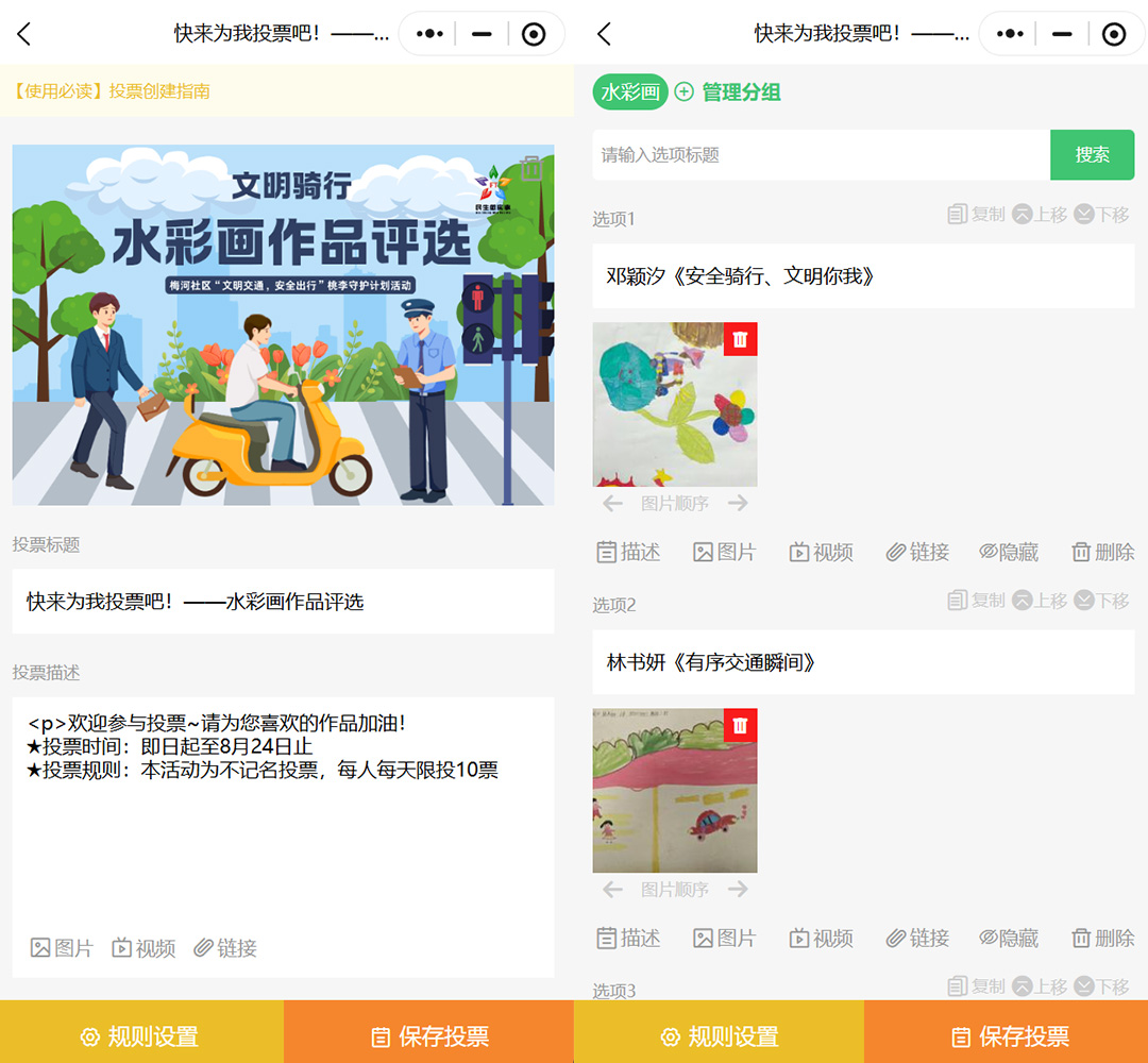 接下来是投票选项的设置,小程序支持图文或视频两种选项形式,每个选项最多可上传9张图片和1个视频,不管是展示宿舍海报设计、微视频作品,还是呈现候选人风采,都能清晰呈现细节。