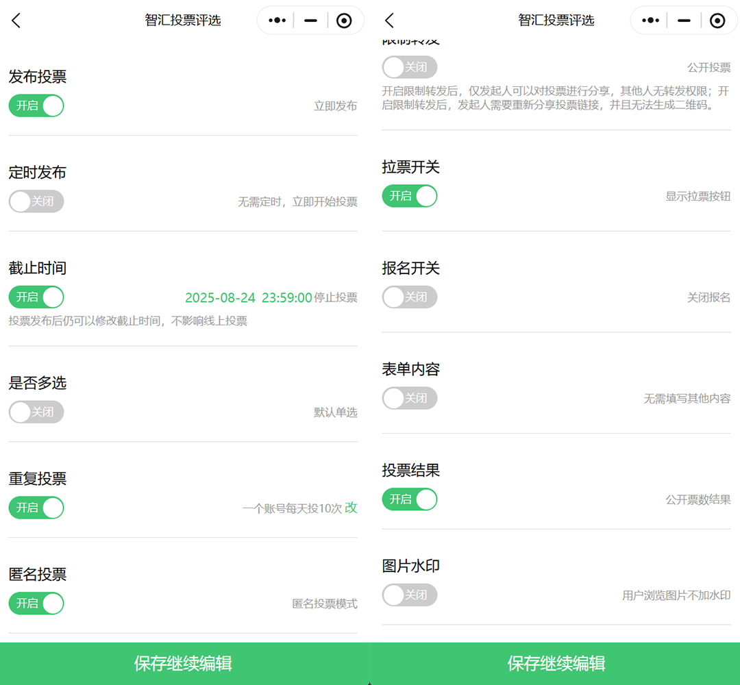 针对拉票和重复投票问题,还能设置每人每日投票次数、是否开启拉票按钮等。比如设定每人每日限投1次,每次可投2-3票,既保证了用户的参与热度,又能有效维护投票公平性。