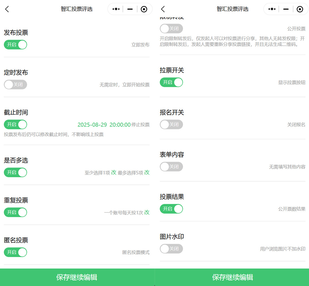 设置投票规则如投票截止时间,按需求可设置单选还是多选,每人每天能投几票,是否公开票数排名等,都在这里设置好,让活动公平公正。