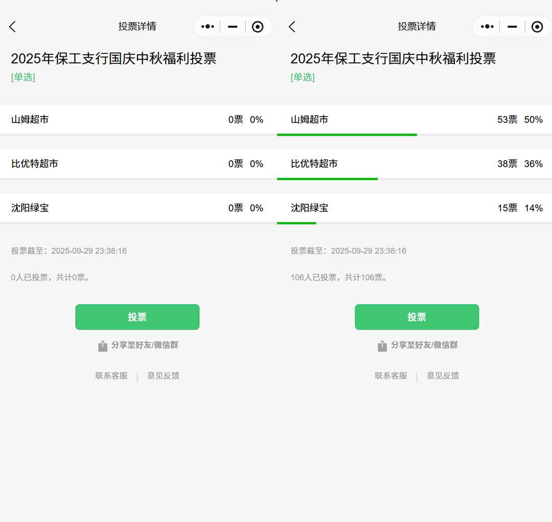 保存投票内容后即可预览投票界面,在我们确认内容无误后,生成链接或二维码转发到群里或朋友圈,群成员点击参与投票即可。后台自动统计,支持筛选与导出结果。