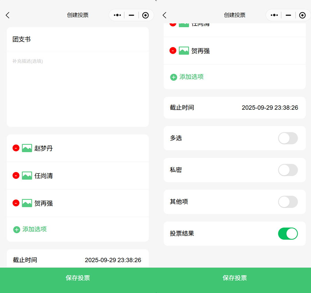 设置投票截止时间,是否多选,是否匿名,是否私密,是否公开投票结果等规则。比如我们需要在特定的内部群内进行投票,那么就需要开启私密功能,防止其他不相干的人参与进来。