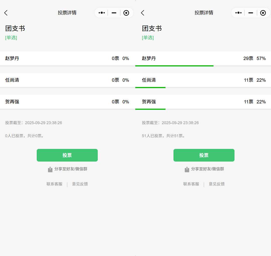 投票小程序自带统计功能,可以实时显示投票结果。投票结果通常包括每个选项的票数、百分比等。最后我们可以在后台下载投票明细或投票结果排名等数据。