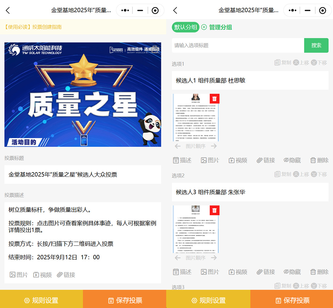 完善投票信息,先填写投票活动标题、活动介绍详情、封面图等基础信息,介绍详情支持图文和视频内容编排,可以详细介绍整个投票活动的内容背景、规则等信息。
