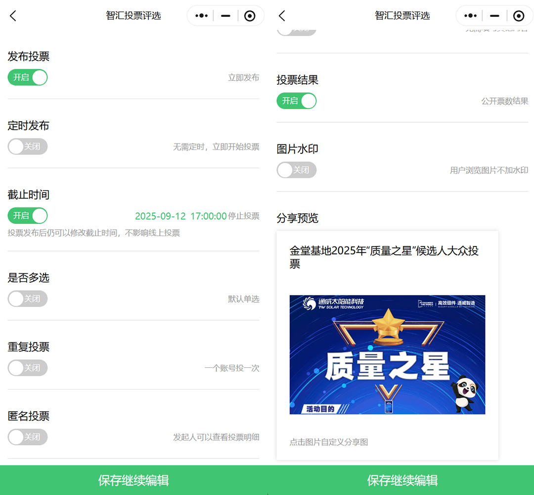 进入投票规则设置,在这里设置投票开始时间和截止时间,是否多选,是否匿名,限制转发等设置,还能限制每个用户投票次数,如每天每人限投3次,设置隐藏排名结果等。