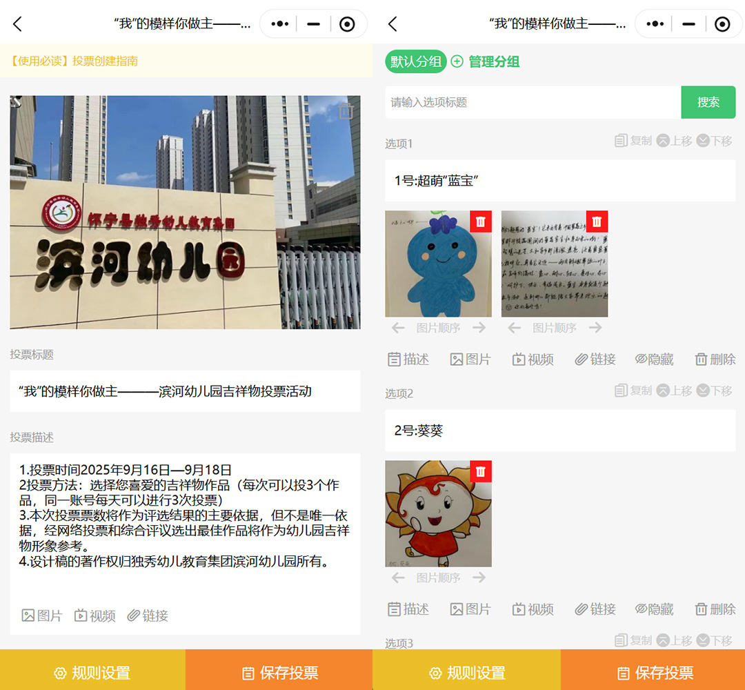完善投票信息:填写投票的标题、描述,上传封面图等基础信息,可补充图文和视频介绍,丰富投票的内容。