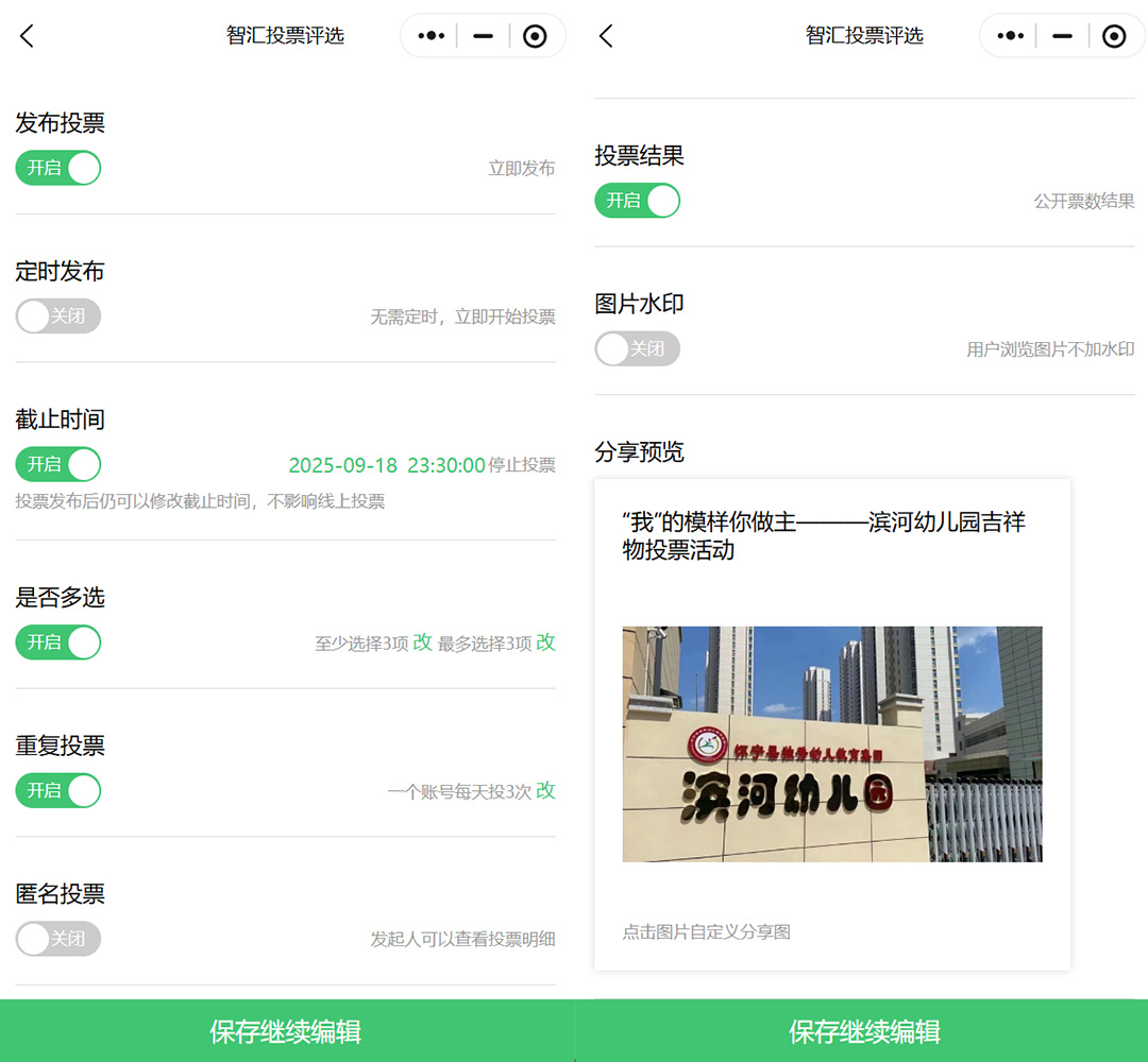 投票规则设置:设置投票的截止时间、是否匿名投票、是否多选等参数,若要进行内部群投票,可以开启限制转发;活动评选投票,则可以设置用户的投票次数,如每天可投3次,活动人气拉满;还可以选择是否公开投票结果,设置图片水印等规则。