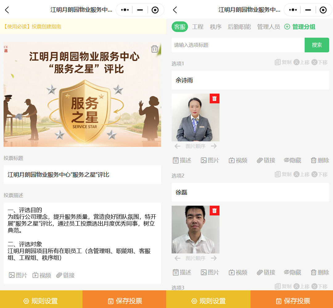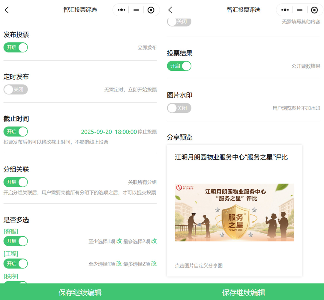 设置投票规则,如投票截止时间,每人每天的投票次数、是否匿名投票、是否公开结果等。