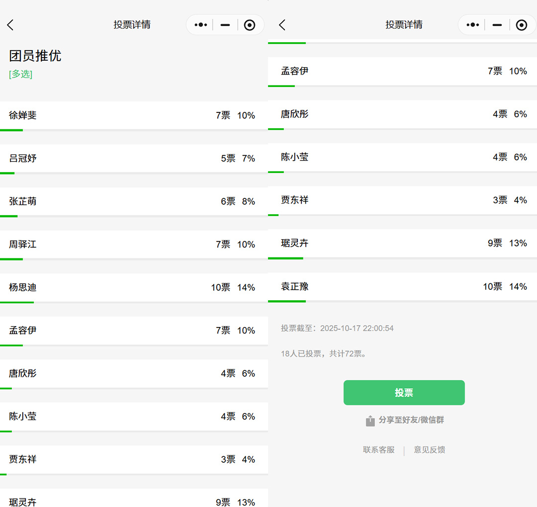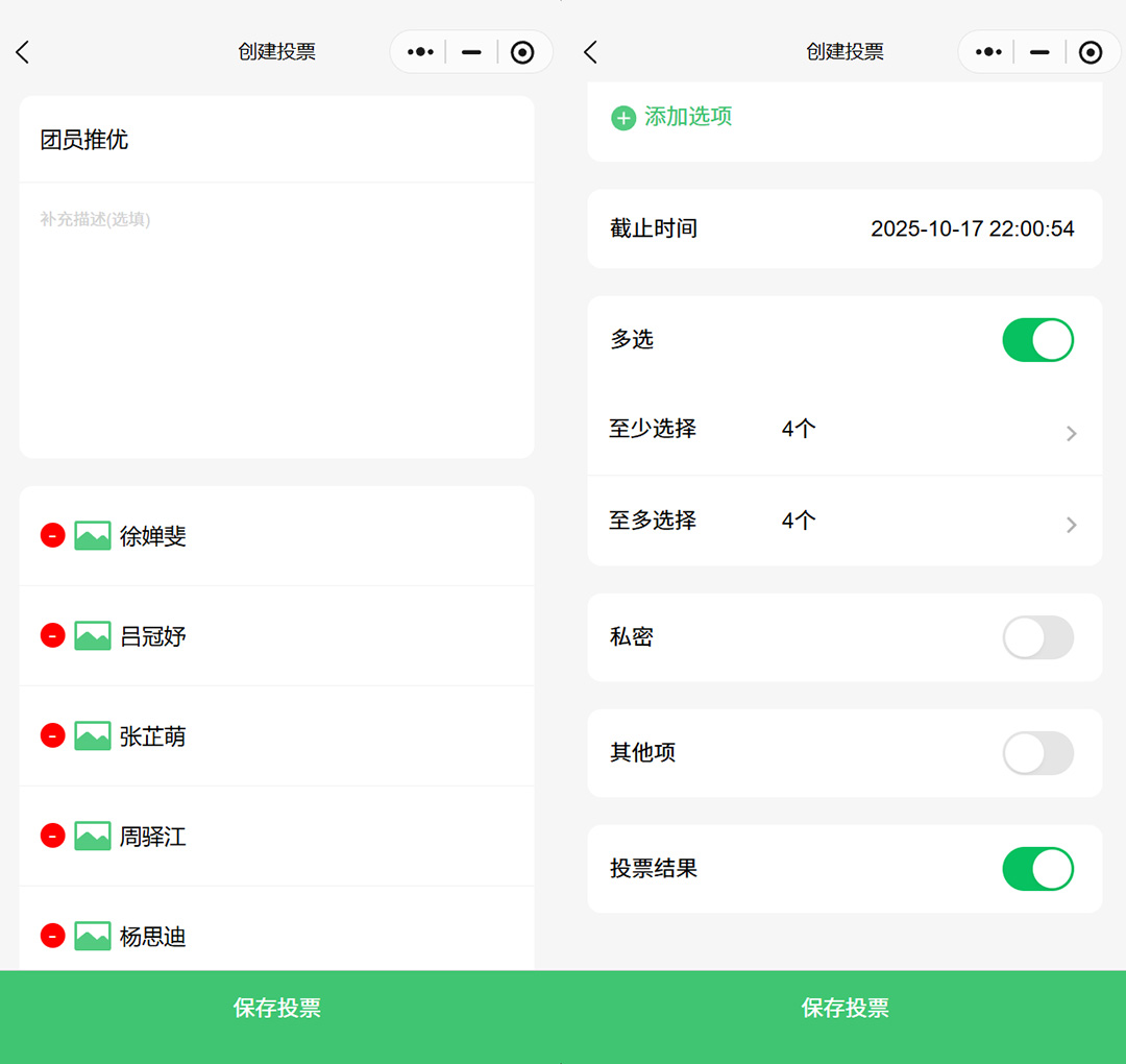 完成投票内容后,即可保存投票并预览效果,在仔细检查并确认投票内容无误后,可以发布并分享投票了,点击分享将投票分享至指定群聊,群成员点击投票小卡片就能参与投票了,最后统计结果并公布。