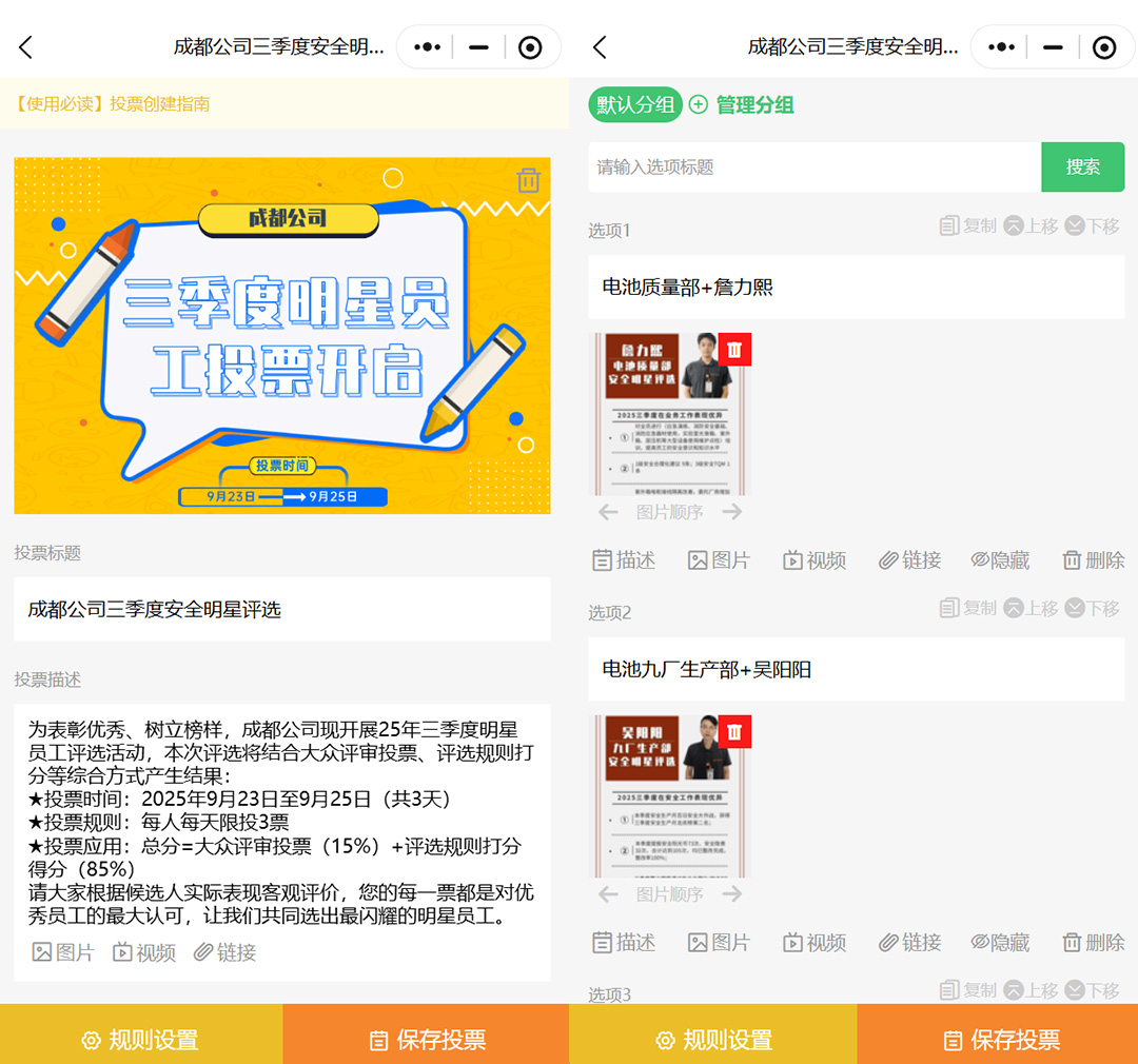 接着补充投票描述信息,可详细说明活动背景、活动时间与规则、评选标准、奖项设置等信息,如投票时间2025年9月23日至9月25日,每人每天限投3票,大众评选投票分数占比等。
