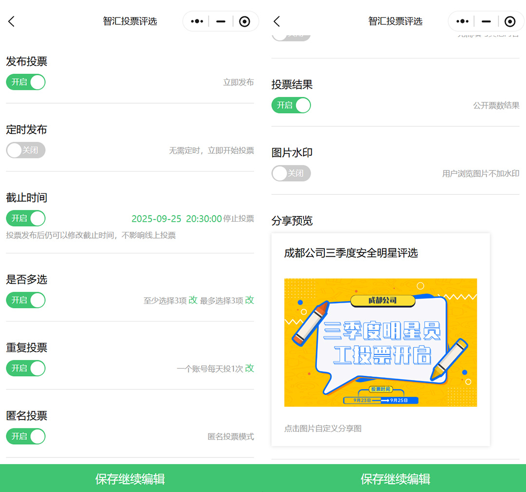 自定义活动的开始与结束时间,若不设置开始时间,发布后将立即生效,投票发布后仍可修改截止时间,便于我们在活动评选过程延长投票时间。