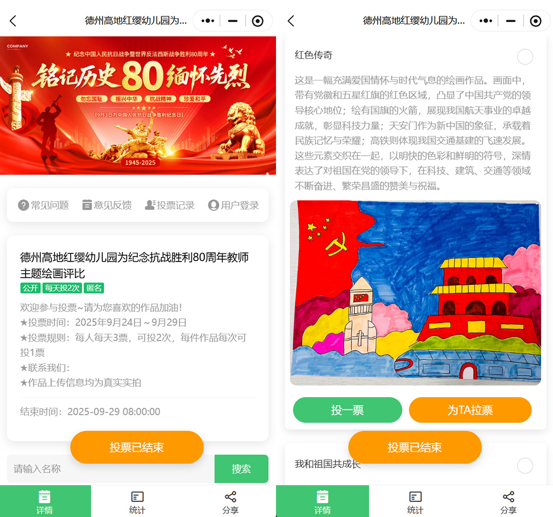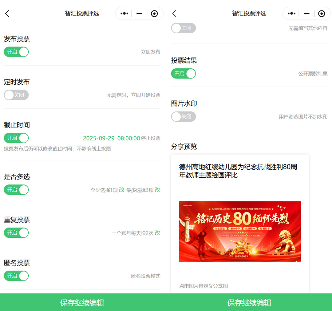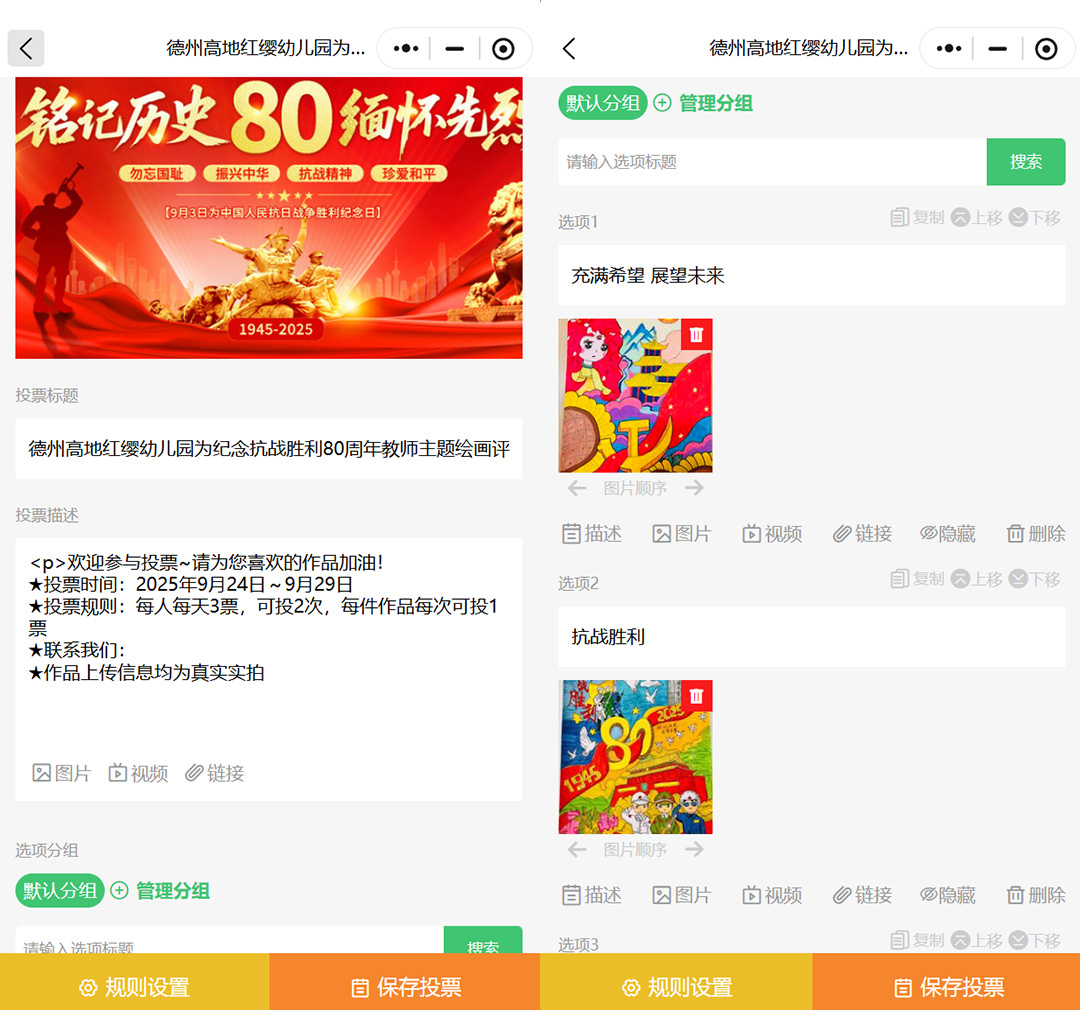 填写投票标题与描述,用一句话点明活动主题,再详细的介绍投票时间、规则等信息。如德州高地红缨幼儿园为纪念抗战胜利80周年教师主题绘画评比,投票时间2025年9月24日~9月29日,每人每天3票,报名作品需要符合真实实拍,再附上封面图,基本信息就搞定了。