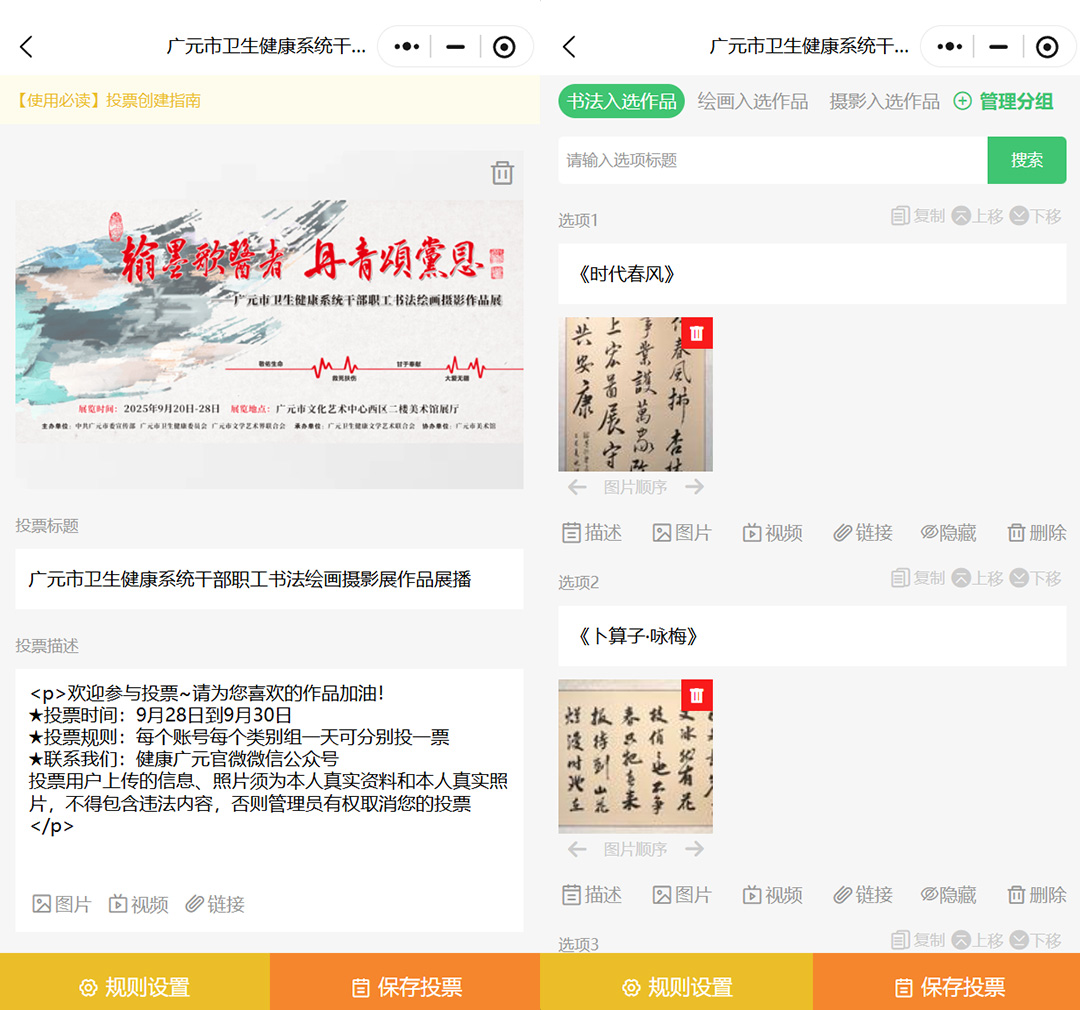 在编辑界面,填写基本信息,添加选项,设置规则,最后美化界面,根据界面指引即可完成投票活动的制作,支持在线报名、作品分组、防刷票、自定义主题、数据导出等专业投票功能,有了它,我们可以轻松搞定投票活动了。