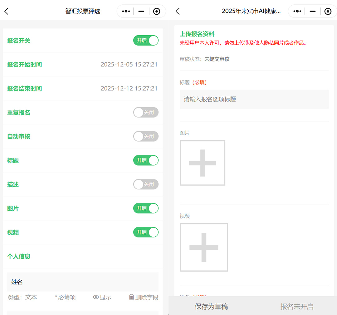 设置报名开始时间和结束时间,补充报名规则介绍,需要提交的作品信息,包括作品标题、作品介绍、作品图片或者图片视频,需要提交的个人信息,如姓名、电话、邮箱等联系方式。