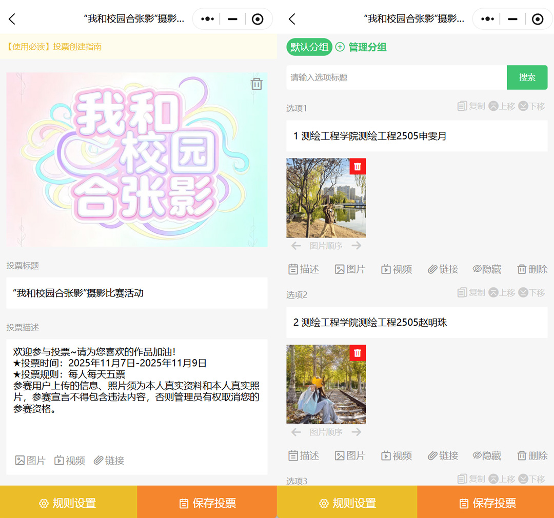 选项支持图文和视频,也可开启在线报名,适合评选类活动,省去手动收集信息的繁琐,提高活动效率。