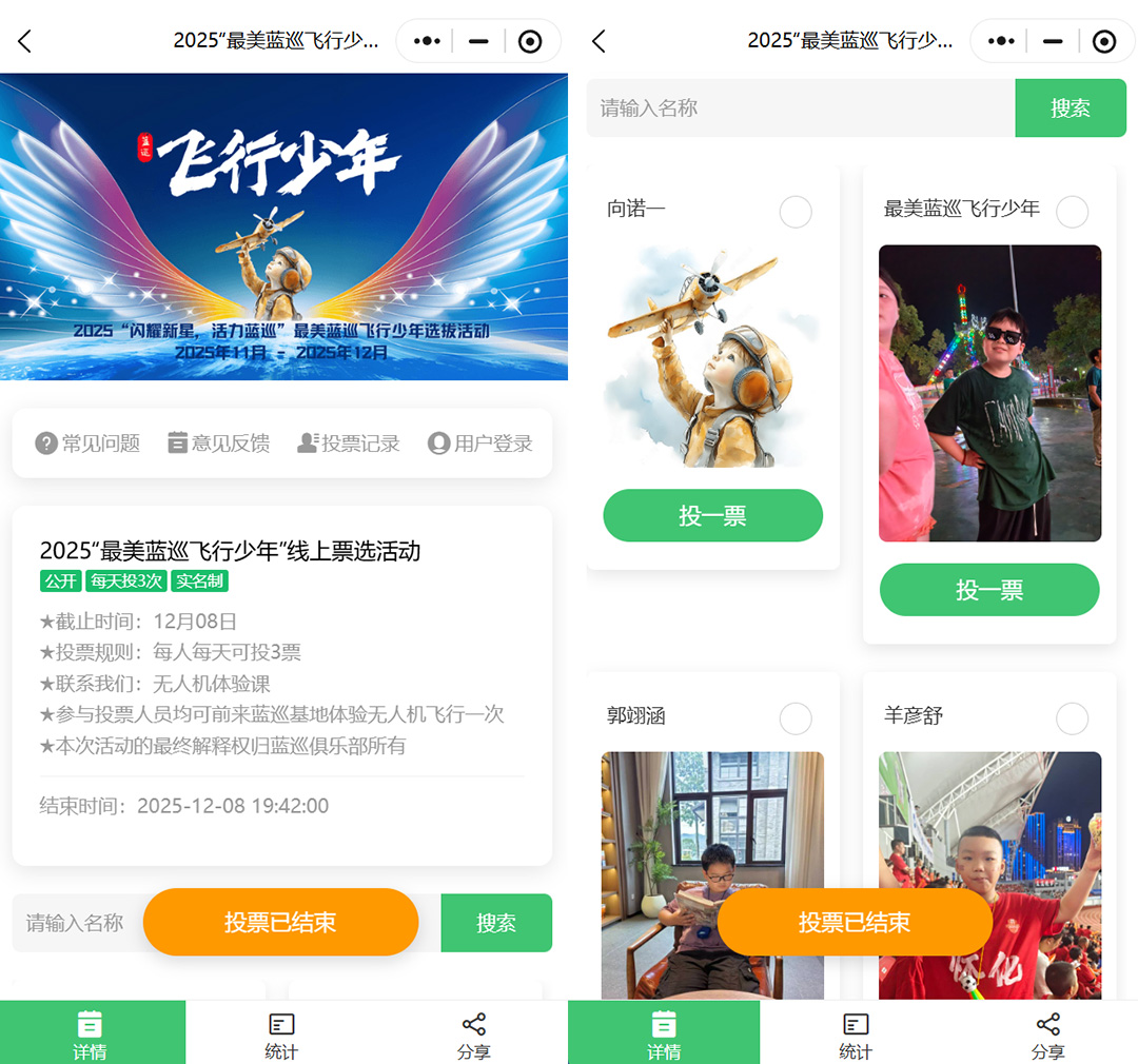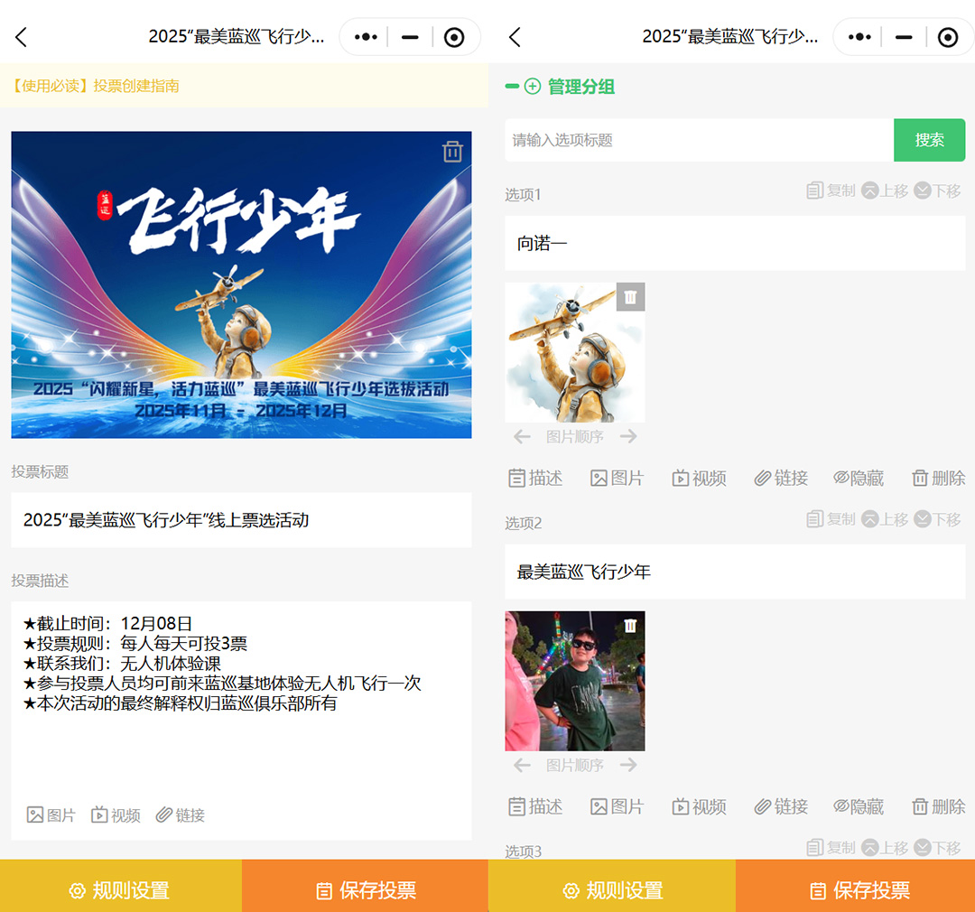 活动名称:输入活动名称,如“2025最美蓝巡飞行少年线上票选活动”。