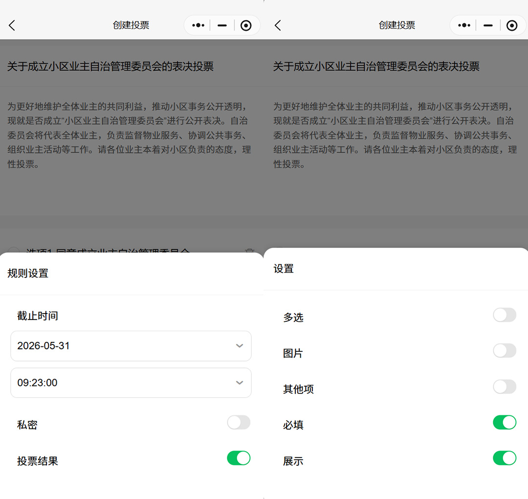 完成投票内容编辑后,即可保存并预览投票效果,拉三五好友投票测试,最后确认无误后分享给好友或群聊,邀请业主参与投票,还可以生成二维码,粘贴到公告栏。